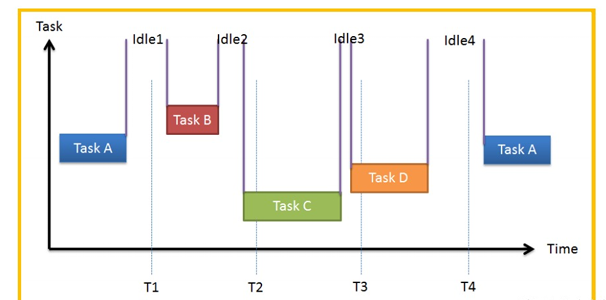 严格来说 FreeRTOS 并不是实时操作系统,因为它是分时复用的。 系统将时间分割成很多时间片,然后轮流执行各个任务。 每个任务都是独立运行的,互不影响,由于切换的频率很快,就感觉像是同时运行的一样。