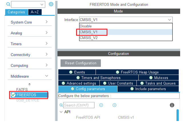5. 选择 FREERTOS 选项,并将 Interface 改为 CMSIS_V1 。V1 和 V2 有啥区别?下文解释。