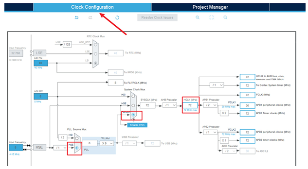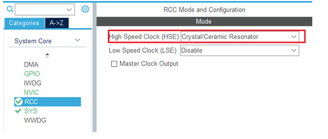 3.将 RCC 里的 HSE 设置为 Crystal/Ceramic Resonator 。