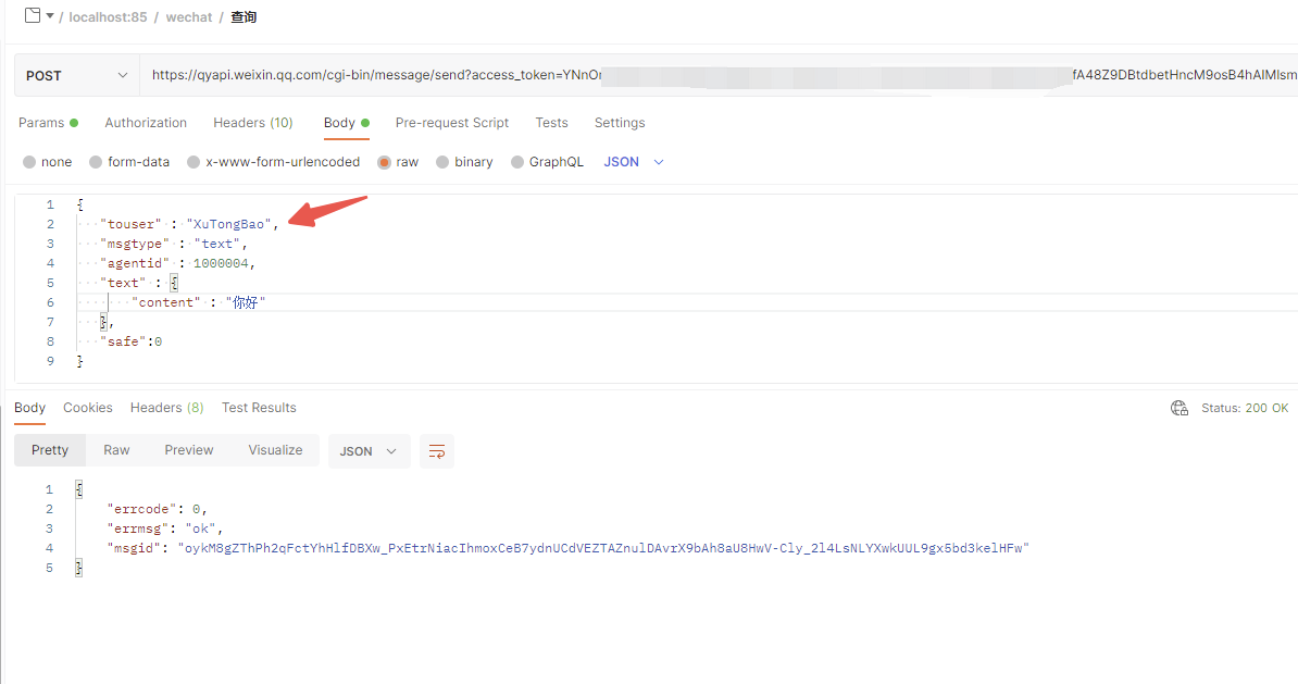 {"touser" : "XuTongBao","msgtype" : "text","agentid" : 1000004,"text" : {"content" : "你好"},"safe":0