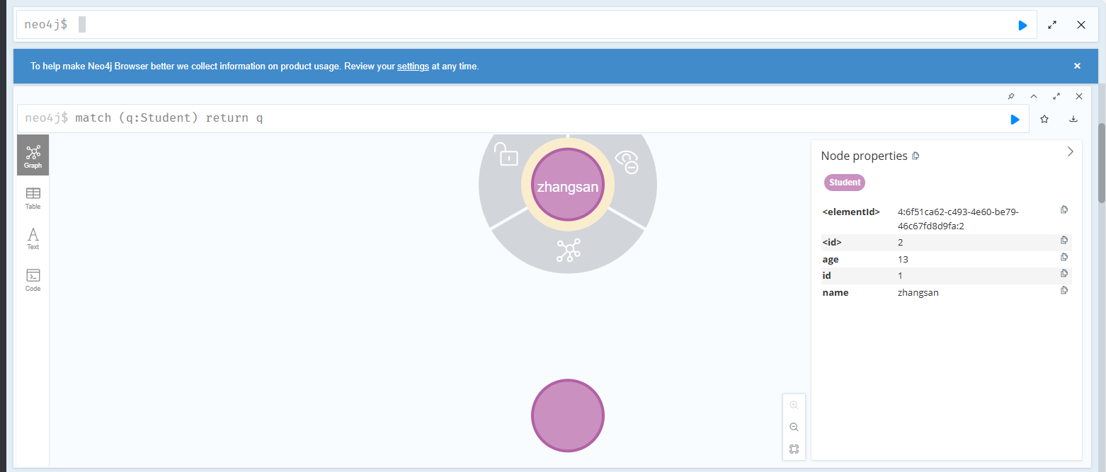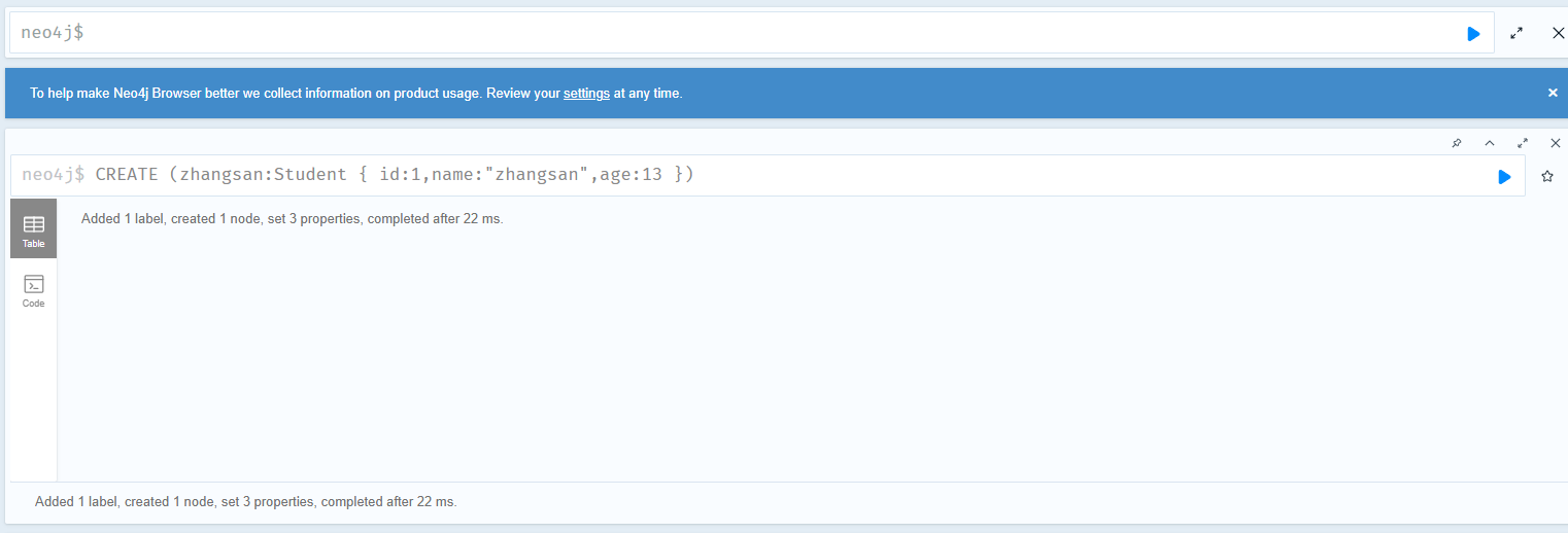 CREATE (zhangsan:Student { id:1,name:"zhangsan",age:13 })