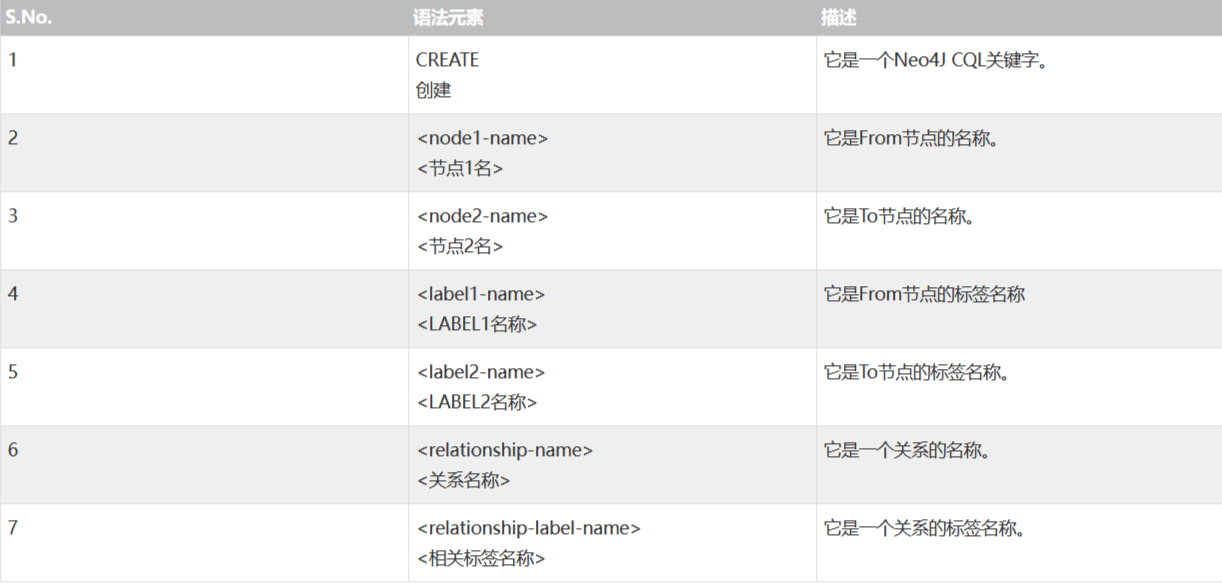CREATE (node1-name:lable1-name) <- [relationship-name:relationship-lable-name]->(node2-name:lable2-name)# 使用已知节点创建带属性的关系: