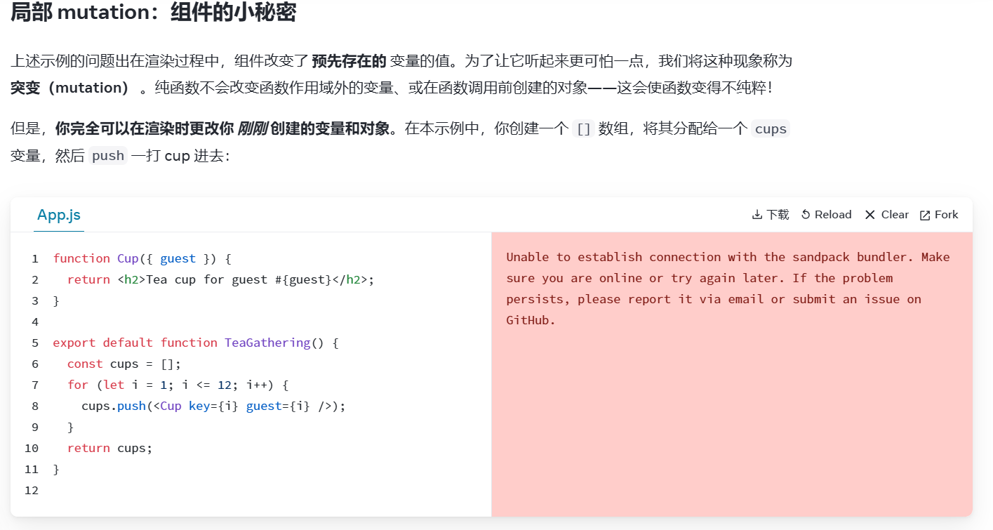 let globalCount = 0;function BadComponent() {globalCount++; // 副作用:修改了外部变量return <div>Count: {globalCount}</div>;