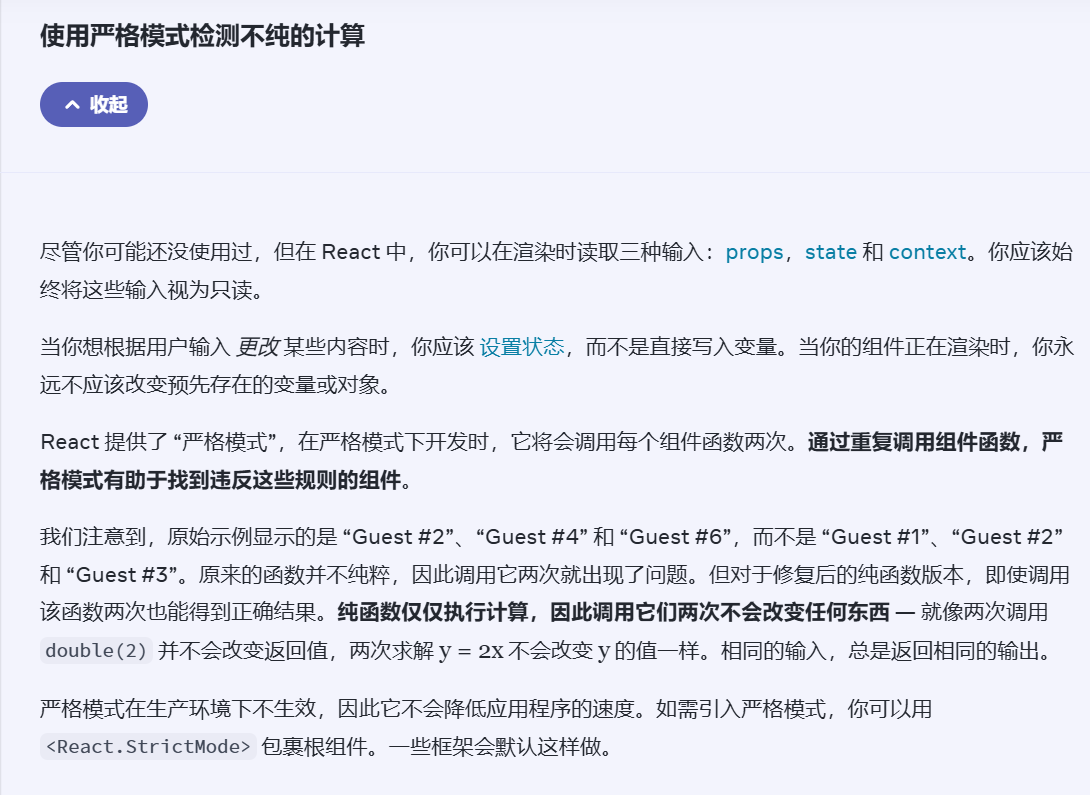 这是关于React 严格模式检测不纯计算的说明内容,可从以下几点解读: