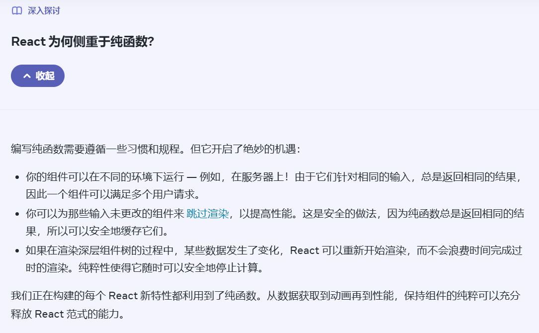 - 如果组件在返回 JSX 之外,还偷偷修改了外部变量或已有对象(比如修改全局变量、修改父组件传入的 props),就会导致组件行为不可预测,难以调试(比如多次渲染结果不一致,或其他组件受意外影响)。