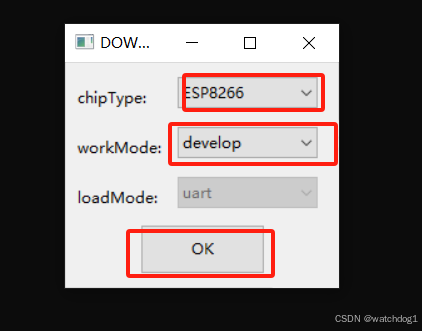 芯片类型:ESP8266、工作模式:develop、烧录模式:uart,点击OK