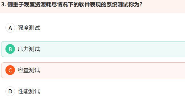 A. 强度测试 - 主要测试系统在正常负载条件下长期运行的可靠性,不是专门针对资源耗尽情况