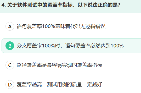 分支覆盖率 | 测试用例是否覆盖了每个判断条件的所有可能结果(True 和 False)。 | “岔路” 是否都走过了。 | 中等 |