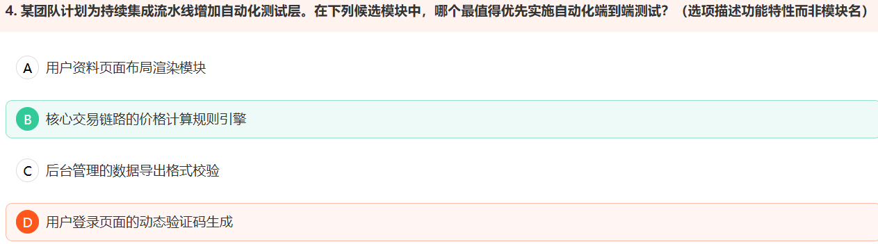 在持续集成流水线中,自动化端到端测试应优先用于验证核心业务功能,以确保整体系统流程的正确性和可靠性。选项B(核心交易链路的价格计算规则引擎)直接涉及关键业务逻辑,价格计算的错误可能导致财务损失、客户投诉或业务中断,而端到端测试能模拟用户交易完整路径(从前端输入到后端计算),提供高业务价值。