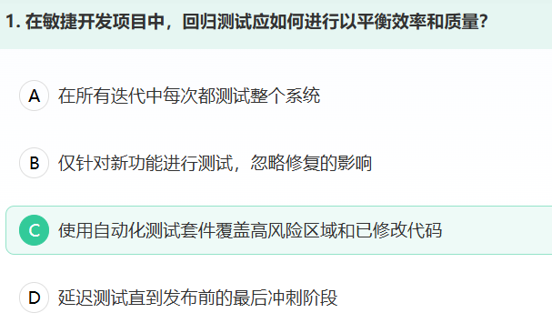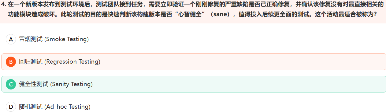在软件测试领域,健全性测试(Sanity Testing)专指针对特定更改或修复进行的快速、窄范围测试,以确认其基本功能正常,确保版本稳定到可进一步测试。选项分析:A.冒烟测试(Smoke Testing)用于验证构建的基本功能,通常覆盖主要功能而非特定修复;B.回归测试(Regression Testing)涉及更全面的错误检查,不强调'快速';C.健全性测试与题目要求完全匹配,尤其是'心智健全'一词直接对应;D.随机测试(Ad-hoc Testing)是非结构化测试,不系统。