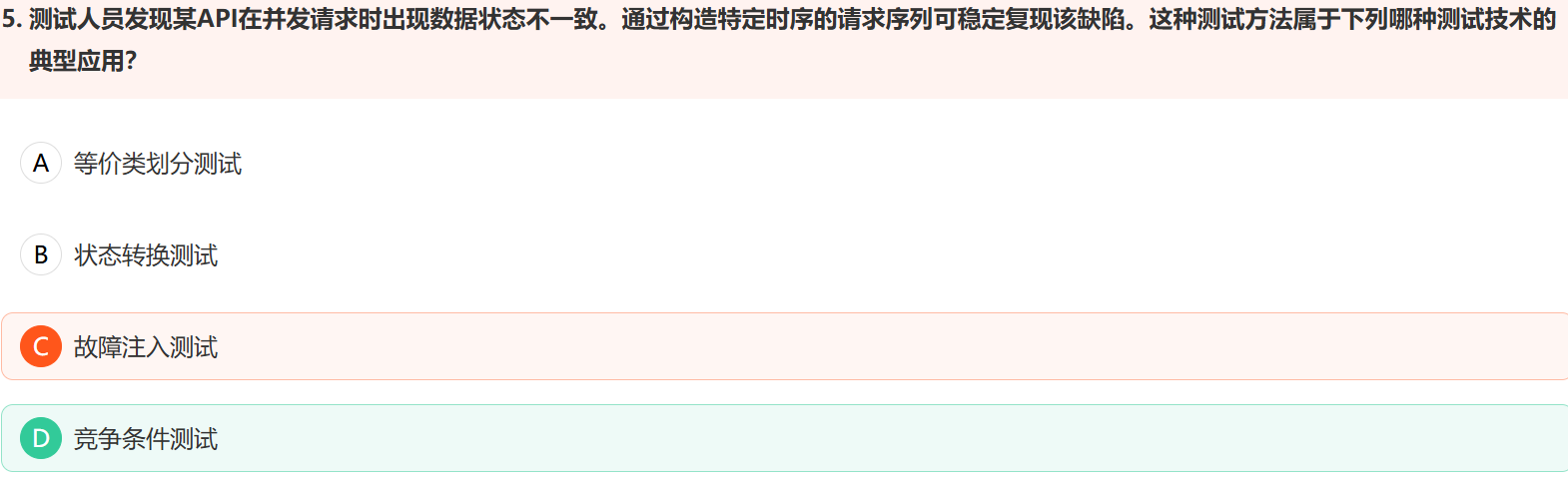 竞争条件测试专门针对并发系统中操作的时序依赖问题,而其他选项不直接相关:等价类划分测试关注输入域分类(A),状态转换测试针对系统状态变迁(B),故障注入测试涉及人为引入故障以评估系统鲁棒性(C)。