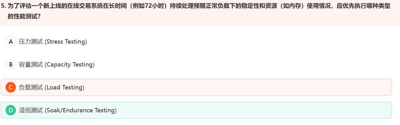 浸泡测试(Soak/Endurance Testing)专门用于在长时间(如72小时)持续运行预期正常负载下,评估系统的稳定性和资源使用情况(如内存泄漏或资源耗尽),这直接符合题目要求。而其他选项:压力测试(A)关注超负载下的行为;容量测试(B)关注系统最大处理能力;负载测试(C)通常针对短期正常负载下的性能指标(如响应时间),不强调长时间稳定性。