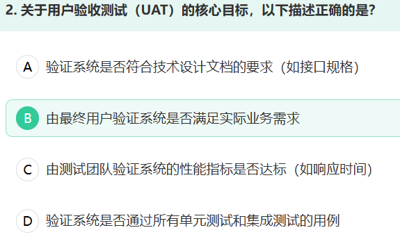 用户验收测试(UAT)的核心目标是确保系统满足最终用户的业务需求,以便系统被正式接受。