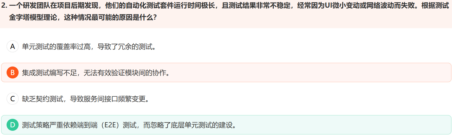 根据测试金字塔模型理论,该情况最可能的原因是测试策略过度依赖端到端(E2E)测试。测试金字塔模型强调应以底层单元测试为基础(数量多、运行快、稳定性高),中层的集成测试为辅,顶层的E2E测试最少(运行慢、易受外部因素如UI变动或网络波动影响)。