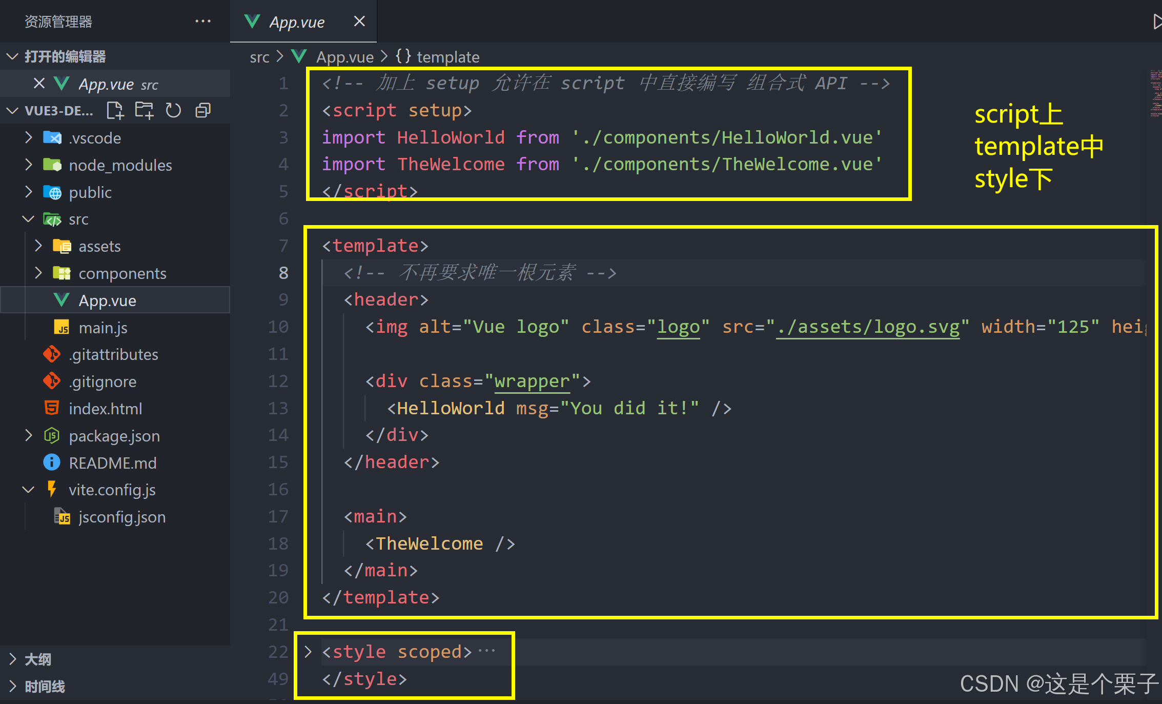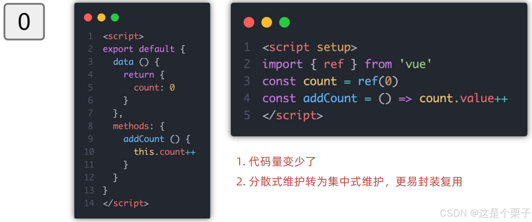 - 变化三:脚本 script 添加 setup 标识支持 组合式 API