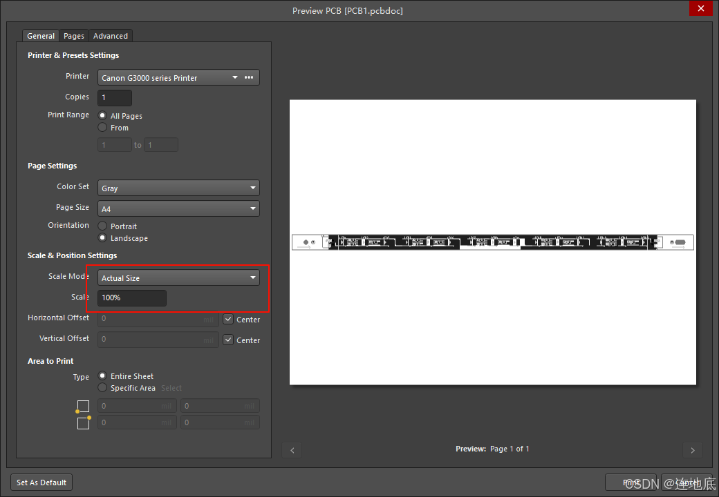 Orientation:视PCB长和宽的长度选择(宽超出A4纸的宽度选择Portrait、否则使用Landscape)