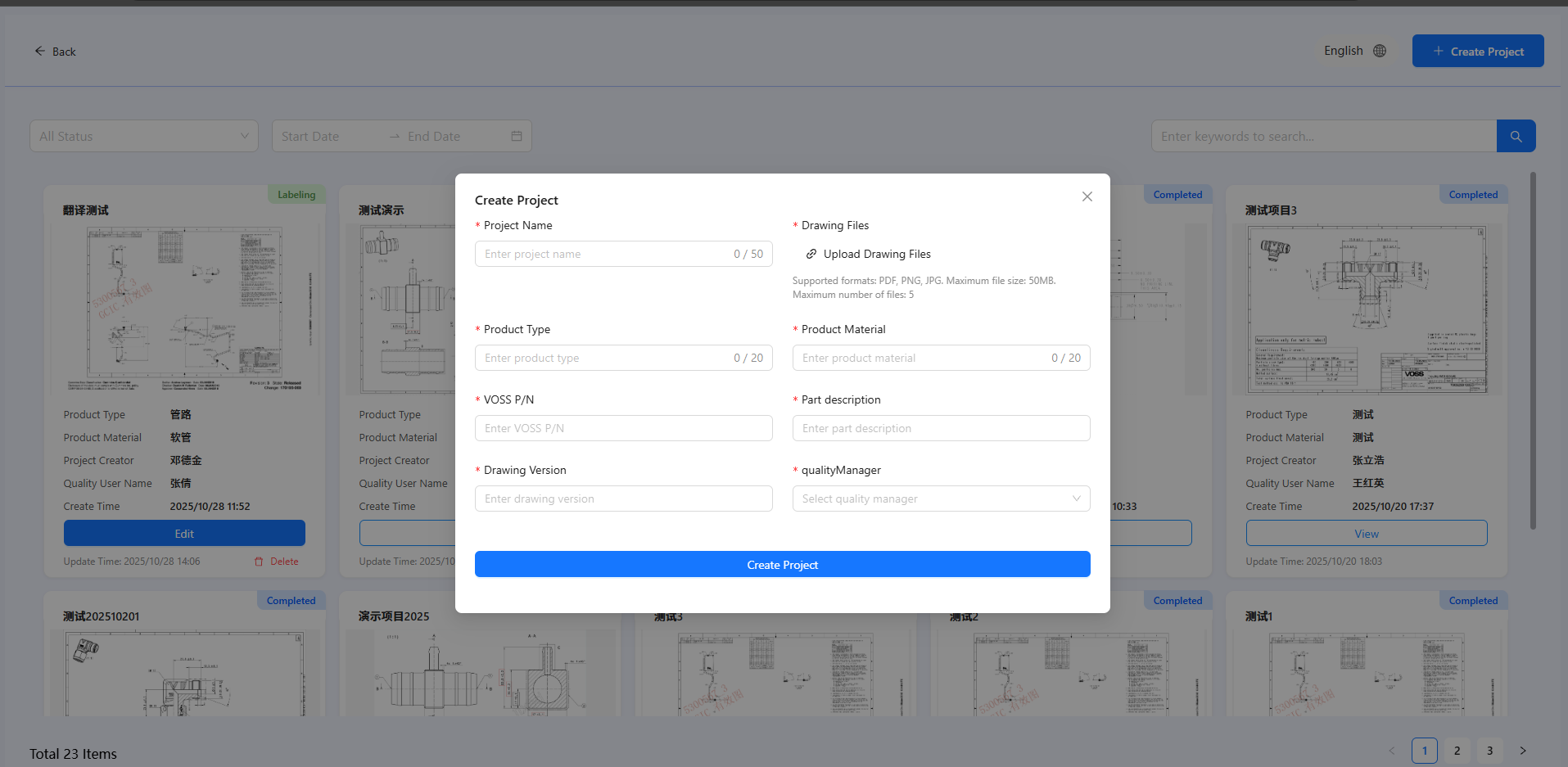 {"back": "Back","createProject": "Create Project","allStatus": "All Status","labeling": "Labeling","confirming": "Confirming","completed": "Completed","startDate": "Start Date","endDate": "End Date","searchPlaceholder": "Enter keywords to search...","noProjects": "No data, you haven't created any projects yet!","noFilteredProjects": "No projects match the filter criteria, please adjust the filters!","loadingTip": "Loading...","productType": "Product Type","unknown": "Unknown","confirmDelete": "Confirm Delete","confirmDeleteContent": "Are you sure you want to delete this project?","ok": "Confirm","cancel": "Cancel","deleteSuccess": "Delete Success","deleteError": "Delete Failed","productMaterial": "Product Material","createBy": "Project Creator","qualityUserName": "Quality User Name","createTime": "Create Time","edit": "Edit","view": "View","updateTime": "Update Time","delete": "Delete","totalProjects": "Total","items": "Items","createProjectModalTitle": "Create Project","projectName": "Project Name","drawingFiles": "Drawing Files","uploadDrawingFiles": "Upload Drawing Files","projectNameRequired": "Project name is required","projectNameMaxLength": "Project name must be at most 50 characters","projectNameWhitespace": "Project name cannot be only whitespace","projectNamePlaceholder": "Enter project name","drawingFilesRequired": "Drawing files are required","fileFormatTip": "Supported formats: PDF, PNG, JPG. Maximum file size: 50MB. Maximum number of files: 5","productTypeRequired": "Product type is required","productTypeMaxLength": "Product type must be at most 20 characters","productTypeWhitespace": "Product type cannot be only whitespace","productTypePlaceholder": "Enter product type","productMaterialRequired": "Product material is required","productMaterialMaxLength": "Product material must be at most 20 characters","productMaterialWhitespace": "Product material cannot be only whitespace","productMaterialPlaceholder": "Enter product material","vossPNRequired": "VOSS P/N is required","vossPNWhitespace": "VOSS P/N cannot be only whitespace","vossPNPlaceholder": "Enter VOSS P/N","partDescriptionRequired": "Part description is required","partDescriptionWhitespace": "Part description cannot be only whitespace","partDescriptionPlaceholder": "Enter part description","drawingVersionRequired": "Drawing version is required","drawingVersionWhitespace": "Drawing version cannot be only whitespace","drawingVersionPlaceholder": "Enter drawing version","qualityManagerRequired": "Quality manager is required","qualityManagerPlaceholder": "Select quality manager","loadingQualityManager": "Loading quality manager...","createProjectButton": "Create Project","loadingQualityManagerError": "Failed to load quality manager","qualityManagerInvalid": "Please select a valid quality manager","drawingFileRequired": "Please upload at least one valid drawing file (ensure the file upload is complete)","projectCreateSuccess": "Project created successfully!","pleaseCompleteAllRequiredFields": "Please complete all required fields","lastSaveTime": "Last Save Time","projectManager": "Project Manager","drawing": "Drawing","draw": "Draw","annotations": "Annotations","viewReport": "View Report","attachmentList": "Attachment List","index": "Index","screenshot": "Screenshot","toleranceValue": "Value","toleranceName": "Tolerance Name","characteristicIdentifier": "Characteristic Identifier","project": "Project","normTolerance": "Normal Tolerance","testingMethods": "Testing Methods","testingRequirements": "Testing Requirements","firstSamplingQuantity": "First Sampling Quantity","afterFirstSamplingQuantity": "After First Sampling Quantity","afterFirstSamplingFrequency": "After First Sampling Frequency","supplierSelfTestRequirements": "Supplier Self-Test Requirements","operation": "Operation","ocrDetect": "OCR Detect","initiateConfirmation": "Initiate Confirmation","extractText": "Extract Text","dragMode": "Drag Mode","resetSelection": "Reset Selection","boxSelectMode": "Box Select Mode","singleAnnotation": "Single Annotation","parsingImage": "Parsing Image","confirmDeleteAnnotation": "Confirm Delete Annotation","confirm": "Confirm"