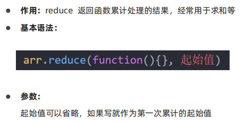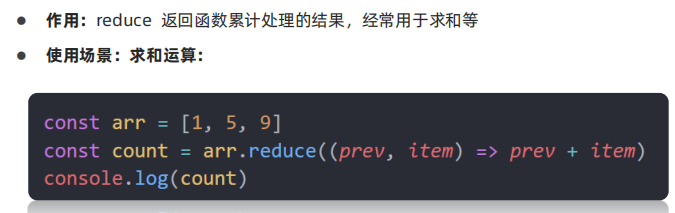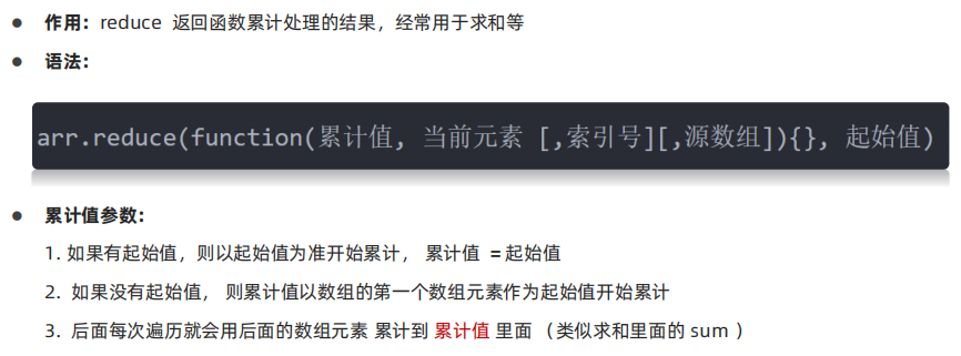 </head><body><script>// arr.reduce(function(累计值, 当前元素){}, 起始值)// arr.reduce(function (prev, item) {// // console.log(11)// // console.log(prev)// return prev + item// }, 0)// arr.reduce(function (prev, item) {// console.log(11)// // console.log(prev)// return prev + item// })const arr = [1, 2, 3]const re = arr.reduce((prev, item) => prev + item)console.log(re)</script>