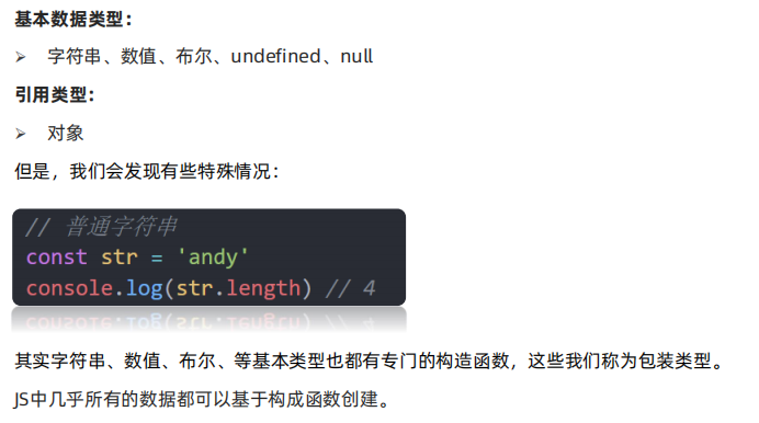 之所以具有对象特征的原因是字符串、数值、布尔类型数据是 JavaScript 底层使用 Object 构造函数“包装”来的,被称为包装类型。