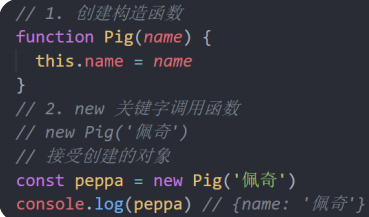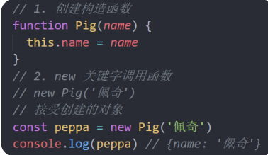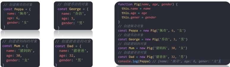 - 使用场景:常规的 {...} 语法允许创建一个对象。比如我们创建了佩奇的对象,继续创建乔治的对象还需要重新写一遍,此时可以通过构造函数来快速创建多个类似的对象。