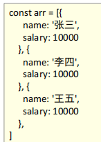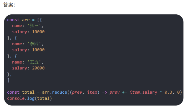 </head><body><script>const arr = [{name: '张三',salary: 10000}, {name: '李四',salary: 10000}, {name: '王五',salary: 20000},]// 涨薪的钱数 10000 * 0.3 // const money = arr.reduce(function (prev, item) {// return prev + item.salary * 0.3// }, 0)const money = arr.reduce((prev, item) => prev + item.salary * 0.3, 0)console.log(money)</script>