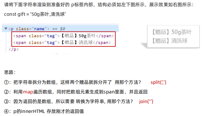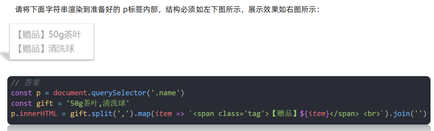 </head><body><div></div><script>const gift = '50g的茶叶,清洗球'// 1. 把字符串拆分为数组// console.log(gift.split(',')) [,]// 2. 根据数组元素的个数,生成 对应 span标签// const str = gift.split(',').map(function (item) {// return `<span>【赠品】 ${item}</span> <br>`// }).join('')// // console.log(str)// document.querySelector('div').innerHTML = strdocument.querySelector('div').innerHTML = gift.split(',').map(item => `<span>【赠品】 ${item}</span> <br>`).join('')</script>