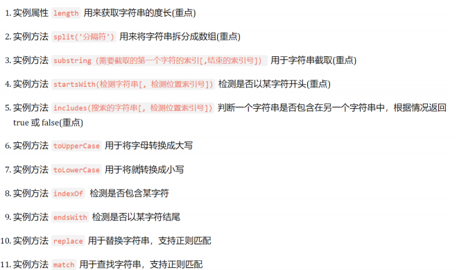 </head><body><script>//1. split 把字符串 转换为 数组 和 join() 相反// const str = 'pink,red'// const arr = str.split(',')// console.log(arr)// const str1 = '2022-4-8'// const arr1 = str1.split('-')// console.log(arr1)// 2. 字符串的截取 substring(开始的索引号[, 结束的索引号])// 2.1 如果省略 结束的索引号,默认取到最后// 2.2 结束的索引号不包含想要截取的部分// const str = '今天又要做核酸了'// console.log(str.substring(5, 7))// 3. startsWith 判断是不是以某个字符开头// const str = 'pink老师上课中'// console.log(str.startsWith('pink'))// 4. includes 判断某个字符是不是包含在一个字符串里面const str = '我是pink老师'console.log(str.includes('pink')) // true</script>