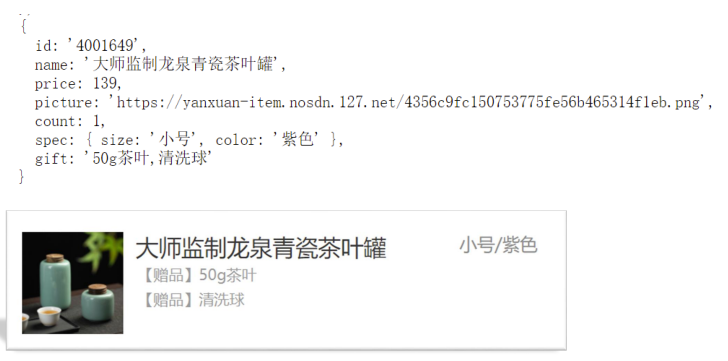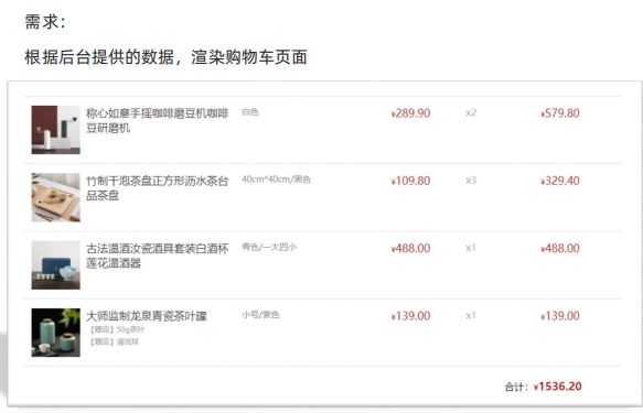 </head><body><div class="list"><!-- <div class="item"><img src="https://yanxuan-item.nosdn.127.net/84a59ff9c58a77032564e61f716846d6.jpg" alt=""><p class="name">称心如意手摇咖啡磨豆机咖啡豆研磨机 <span class="tag">【赠品】10优惠券</span></p><p class="spec">白色/10寸</p><p class="price">289.90</p><p class="count">x2</p><p class="sub-total">579.80</p></div> --></div><div class="total"><div>合计:<span class="amount">1000.00</span></div></div><script>const goodsList = [{id: '4001172',name: '称心如意手摇咖啡磨豆机咖啡豆研磨机',price: 289.9,picture: 'https://yanxuan-item.nosdn.127.net/84a59ff9c58a77032564e61f716846d6.jpg',count: 2,spec: { color: '白色' }},{id: '4001009',name: '竹制干泡茶盘正方形沥水茶台品茶盘',price: 109.8,picture: 'https://yanxuan-item.nosdn.127.net/2d942d6bc94f1e230763e1a5a3b379e1.png',count: 3,spec: { size: '40cm*40cm', color: '黑色' }},{id: '4001874',name: '古法温酒汝瓷酒具套装白酒杯莲花温酒器',price: 488,picture: 'https://yanxuan-item.nosdn.127.net/44e51622800e4fceb6bee8e616da85fd.png',count: 1,spec: { color: '青色', sum: '一大四小' }},{id: '4001649',name: '大师监制龙泉青瓷茶叶罐',price: 139,picture: 'https://yanxuan-item.nosdn.127.net/4356c9fc150753775fe56b465314f1eb.png',count: 1,spec: { size: '小号', color: '紫色' },gift: '50g茶叶,清洗球,宝马, 奔驰'}]// 1. 根据数据渲染页面document.querySelector('.list').innerHTML = goodsList.map(item => {// console.log(item) // 每一条对象// 对象解构 item.price item.countconst { picture, name, count, price, spec, gift } = item// 规格文字模块处理const text = Object.values(spec).join('/')// 计算小计模块 单价 * 数量 保留两位小数 // 注意精度问题,因为保留两位小数,所以乘以 100 最后除以100const subTotal = ((price * 100 * count) / 100).toFixed(2)// 处理赠品模块 '50g茶叶,清洗球'const str = gift ? gift.split(',').map(item => `<span class="tag">【赠品】${item}</span> `).join('') : ''return `<div class="item"><img src=${picture} alt=""><p class="name">${name} ${str} </p><p class="spec">${text} </p><p class="price">${price.toFixed(2)}</p><p class="count">x${count}</p><p class="sub-total">${subTotal}</p></div>`}).join('')// 3. 合计模块const total = goodsList.reduce((prev, item) => prev + (item.price * 100 * item.count) / 100, 0)// console.log(total)document.querySelector('.amount').innerHTML = total.toFixed(2)</script>