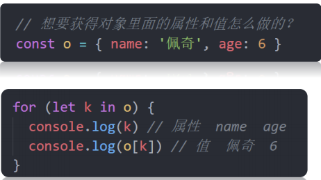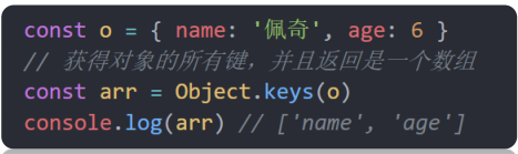 </head><body><script>const o = { uname: 'pink', age: 18 }// 1.获得所有的属性名console.log(Object.keys(o)) //返回数组['uname', 'age']// 2. 获得所有的属性值console.log(Object.values(o)) // ['pink', 18]// 3. 对象的拷贝// const oo = {}// Object.assign(oo, o)// console.log(oo)Object.assign(o, { gender: '女' })console.log(o)</script>