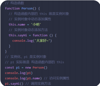 通过构造函数创建的对象称为实例对象,实例对象中的属性和方法称为实例成员。