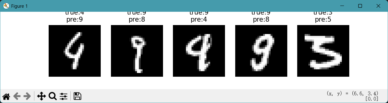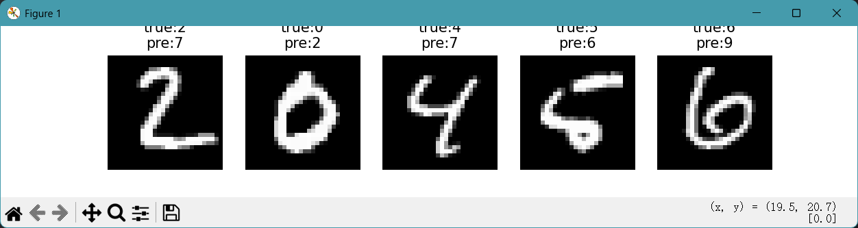 [0]:取元组中的第一个元素(即错误样本的索引数组)。例如上面这个元组就是取出array([5, 10, 15])这个数组[:5]:截取前 5 个索引(只看前 5 个错误样本)。取出数组中前五个元素