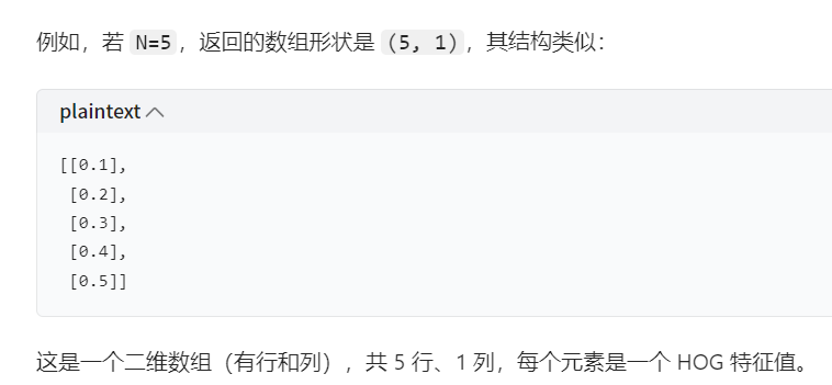hog.compute()函数默认要求输入图像为 3 通道(即使三个通道内容相同),否则可能报错,因此需要这一步转换。 hog.compute(img_3d)返回一个二维数组(N, 1),而flatten让它变成一维数组N是 HOG 特征的总数量(例如 144,由前面的参数计算得出),表示有N个特征值。1表示这些特征值被组织成1 列,每个特征值单独占一行。