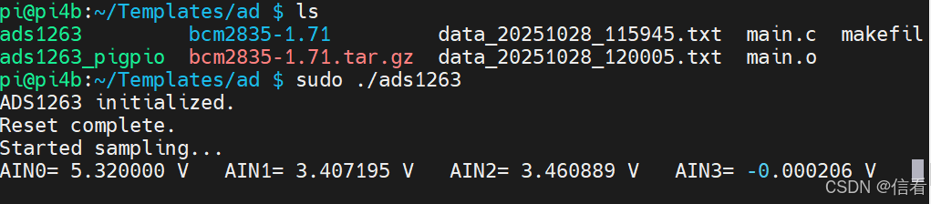 }int main(void){// 导出并配置 GPIOgpio_export(PIN_DRDY);gpio_export(PIN_RESET);gpio_export(PIN_CS);gpio_set_dir(PIN_DRDY, "in");gpio_set_dir(PIN_RESET, "out");gpio_set_dir(PIN_CS, "out");gpio_write(PIN_CS, 1);gpio_write(PIN_RESET, 1);// 打开 SPIif(spi_open()<0){fprintf(stderr,"open spidev failed\n");return 1;}printf("ADS1263 initialized.\n");init_ads1263();printf("Reset complete.\n");const double vref = 5.32; // 按你的实际 AVDD 或外参电压const int gain = 1;// 预选通道并启动select_single_ended(0);write_cmd(CMD_START1);printf("Started sampling...\n");// 丢弃第一帧if(wait_drdy(0.5)==0) (void)read_data();int32_t code[4]={0};for(;;){// AIN0..3 轮询for(int ch=0; ch<4; ch++){select_single_ended((uint8_t)ch);if(wait_drdy(0.5)==0) code[ch] = read_data();}double v0 = code_to_volt(code[0], vref, gain);double v1 = code_to_volt(code[1], vref, gain);double v2 = code_to_volt(code[2], vref, gain);double v3 = code_to_volt(code[3], vref, gain);printf("\rAIN0= %.6f V AIN1= %.6f V AIN2= %.6f V AIN3= %.6f V ", v0,v1,v2,v3);fflush(stdout);// 轻微节流usleep(1000);}// 不会到达write_cmd(CMD_STOP1);spi_close();gpio_unexport(PIN_DRDY);gpio_unexport(PIN_RESET);gpio_unexport(PIN_CS);return 0;