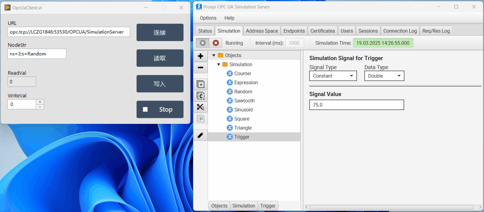 下图是根据上面的要求最终的运行结果,可以读写PLC寄存器,OPC UA Simulation Server中的Trigger值变化会主动触发一个显示变化后值的弹窗。
