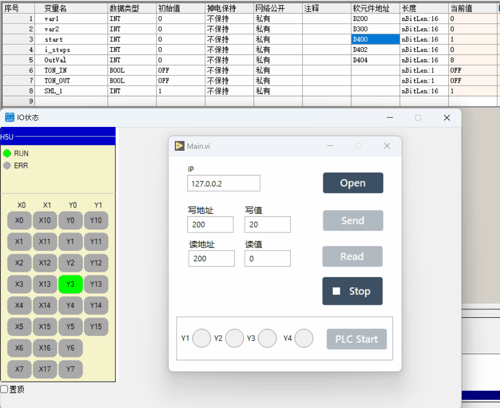 本节的范例执行如下,点击Open连接PLC后,可以发送和读取变量中的值。