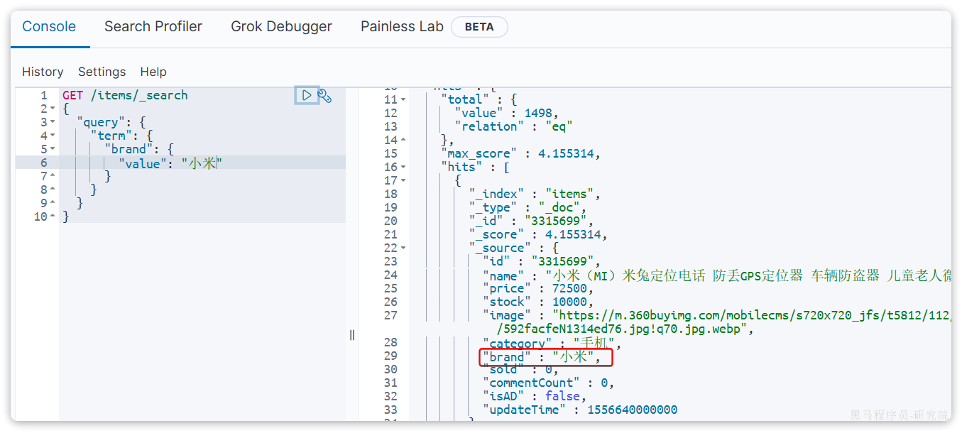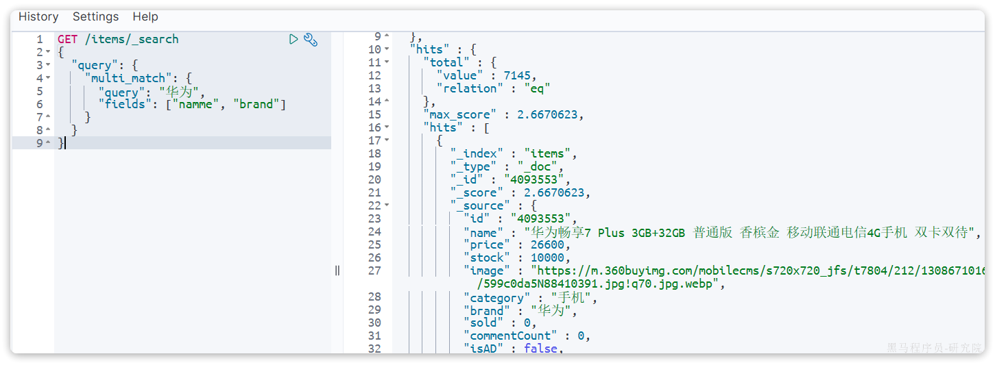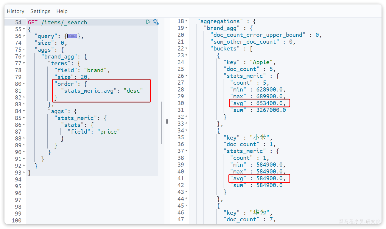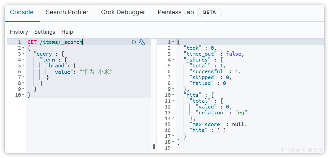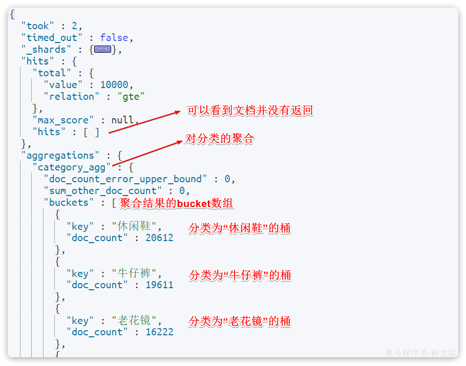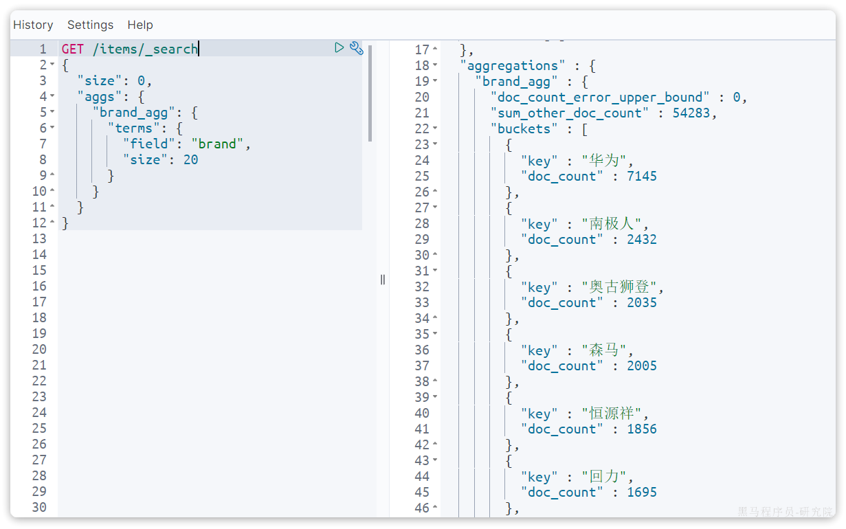 {"took" : 2,"timed_out" : false,"hits" : {"total" : {"value" : 13,"relation" : "eq"},"max_score" : null,"hits" : [ ]},"aggregations" : {"brand_agg" : {"doc_count_error_upper_bound" : 0,"sum_other_doc_count" : 0,"buckets" : [{"key" : "华为","doc_count" : 7},{"key" : "Apple","doc_count" : 5},{"key" : "小米","doc_count" : 1}]}}