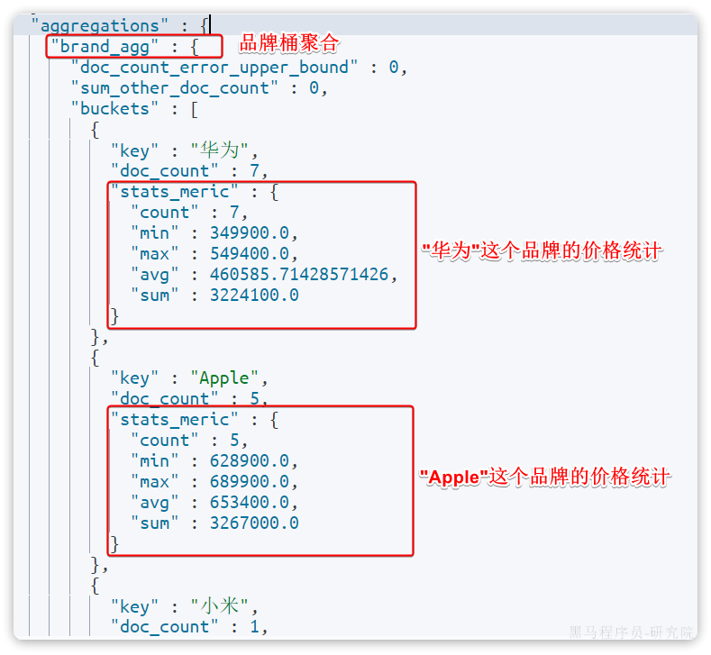 由于stats是对brand_agg形成的每个品牌桶内文档分别做统计,因此每个品牌都会统计出自己的价格最小、最大、平均值。