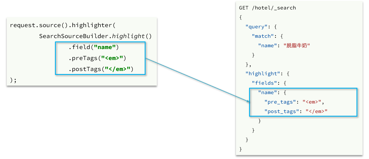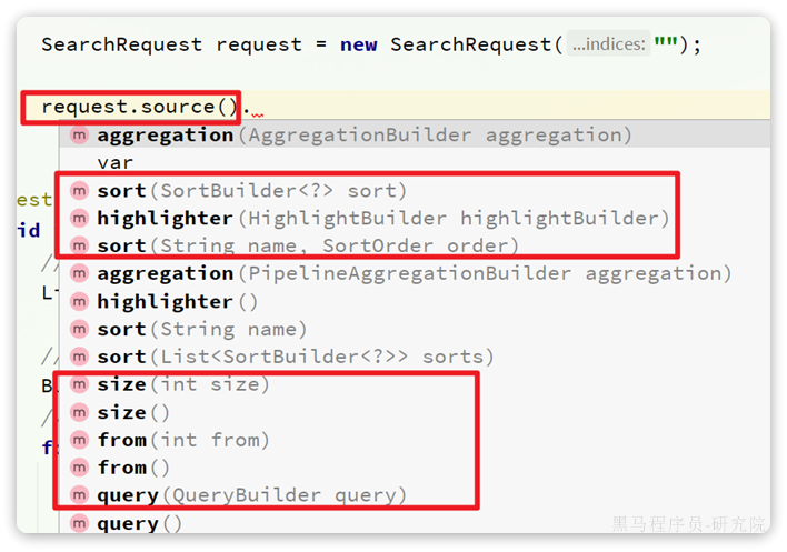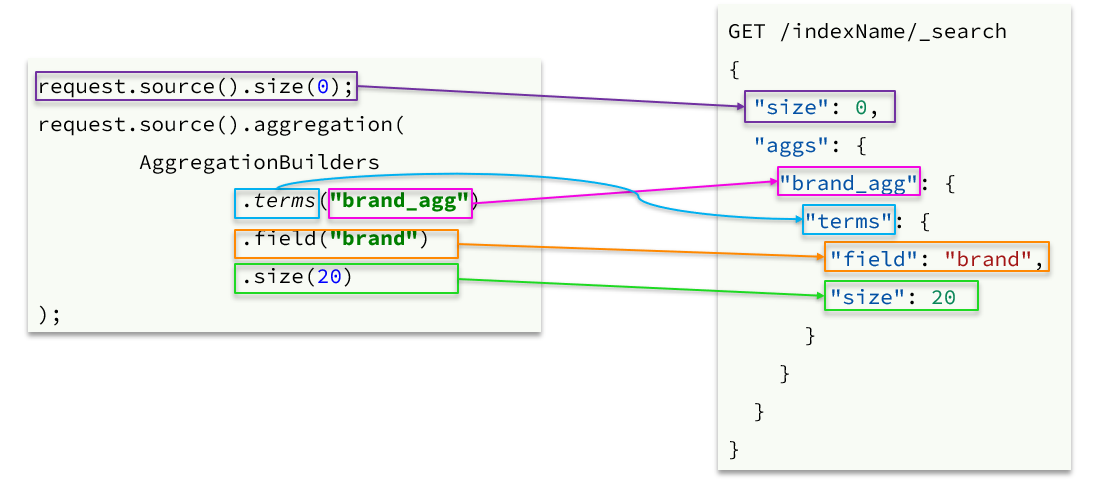 可以看到在DSL中,aggs聚合条件与query条件是同一级别,都属于查询JSON参数。因此依然是利用request.source()方法来设置。