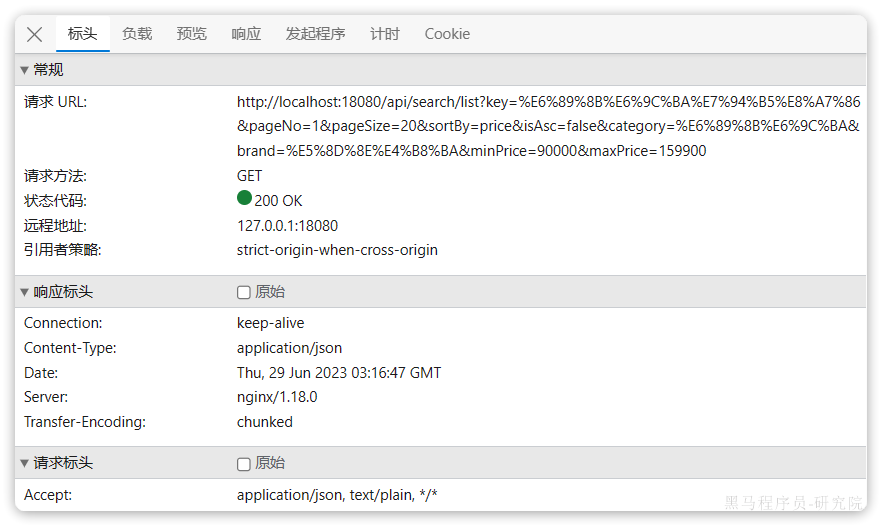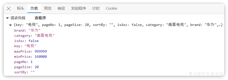 在黑马商城的搜索页面,输入关键字,点击搜索时,会发现前端会发起查询商品的请求: