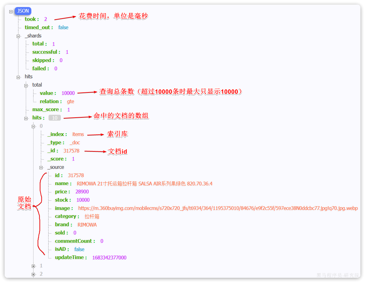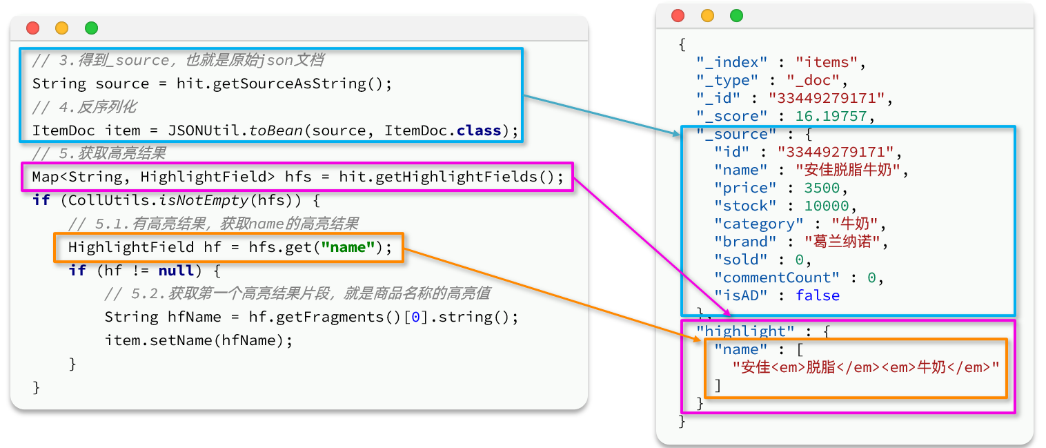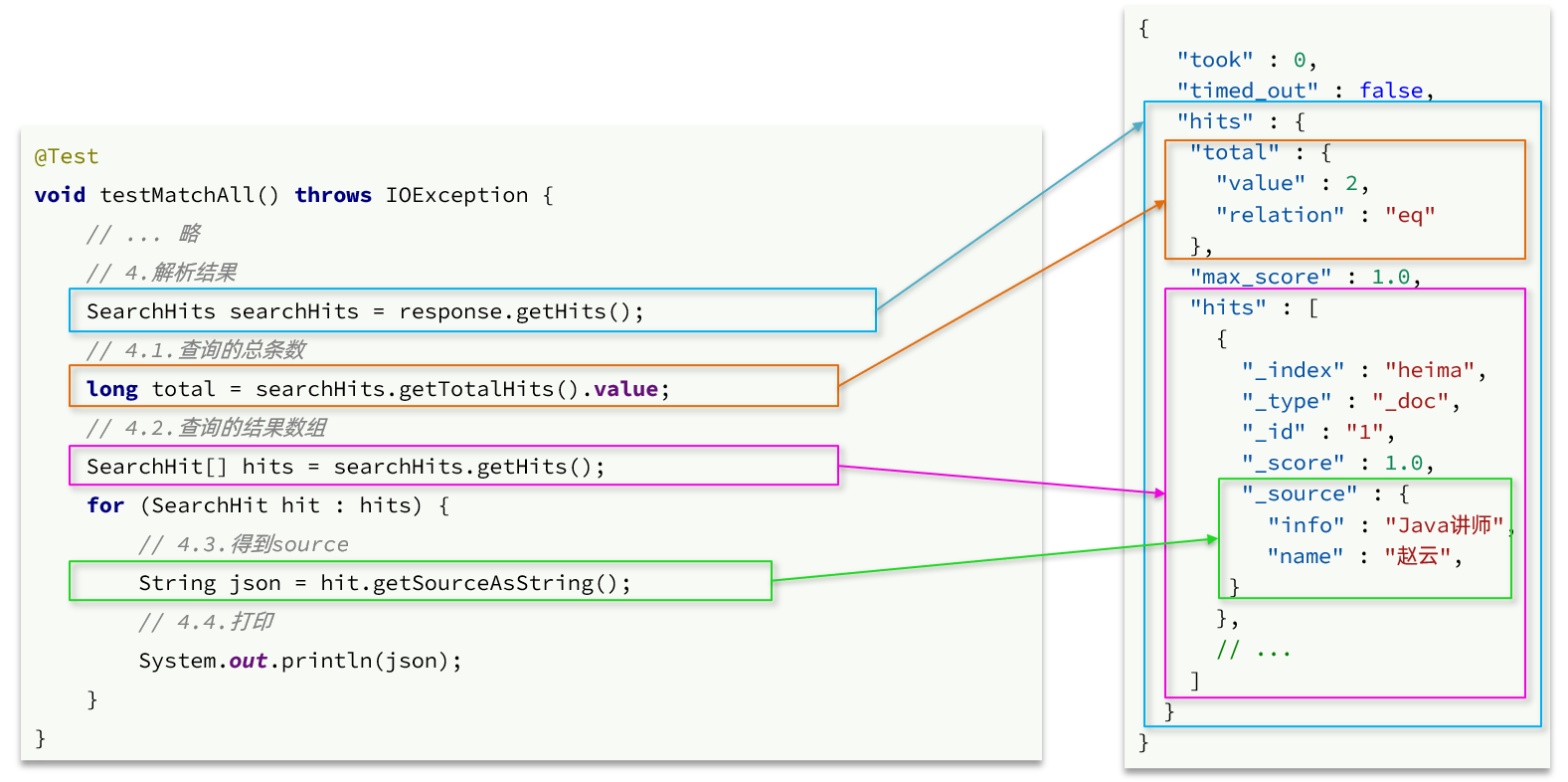 private void handleResponse(SearchResponse response) {SearchHits searchHits = response.getHits();// 1.获取总条数long total = searchHits.getTotalHits().value;System.out.println("共搜索到" + total + "条数据");// 2.遍历结果数组SearchHit[] hits = searchHits.getHits();for (SearchHit hit : hits) {// 3.得到_source,也就是原始json文档String source = hit.getSourceAsString();// 4.反序列化ItemDoc item = JSONUtil.toBean(source, ItemDoc.class);// 5.获取高亮结果Map<String, HighlightField> hfs = hit.getHighlightFields();if (CollUtils.isNotEmpty(hfs)) {// 5.1.有高亮结果,获取name的高亮结果HighlightField hf = hfs.get("name");if (hf != null) {// 5.2.获取第一个高亮结果片段,就是商品名称的高亮值String hfName = hf.getFragments()[0].string();item.setName(hfName);}}System.out.println(item);}