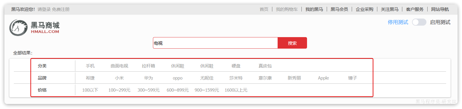 例如搜索电视,那么搜索结果中展示的肯定只有电视,而此时过滤条件中的分类就不能还出现手机、拉杆箱等内容。过滤条件的品牌中就不能出现与电视无关的品牌。而是应该展示搜索结果中存在的分类和品牌。