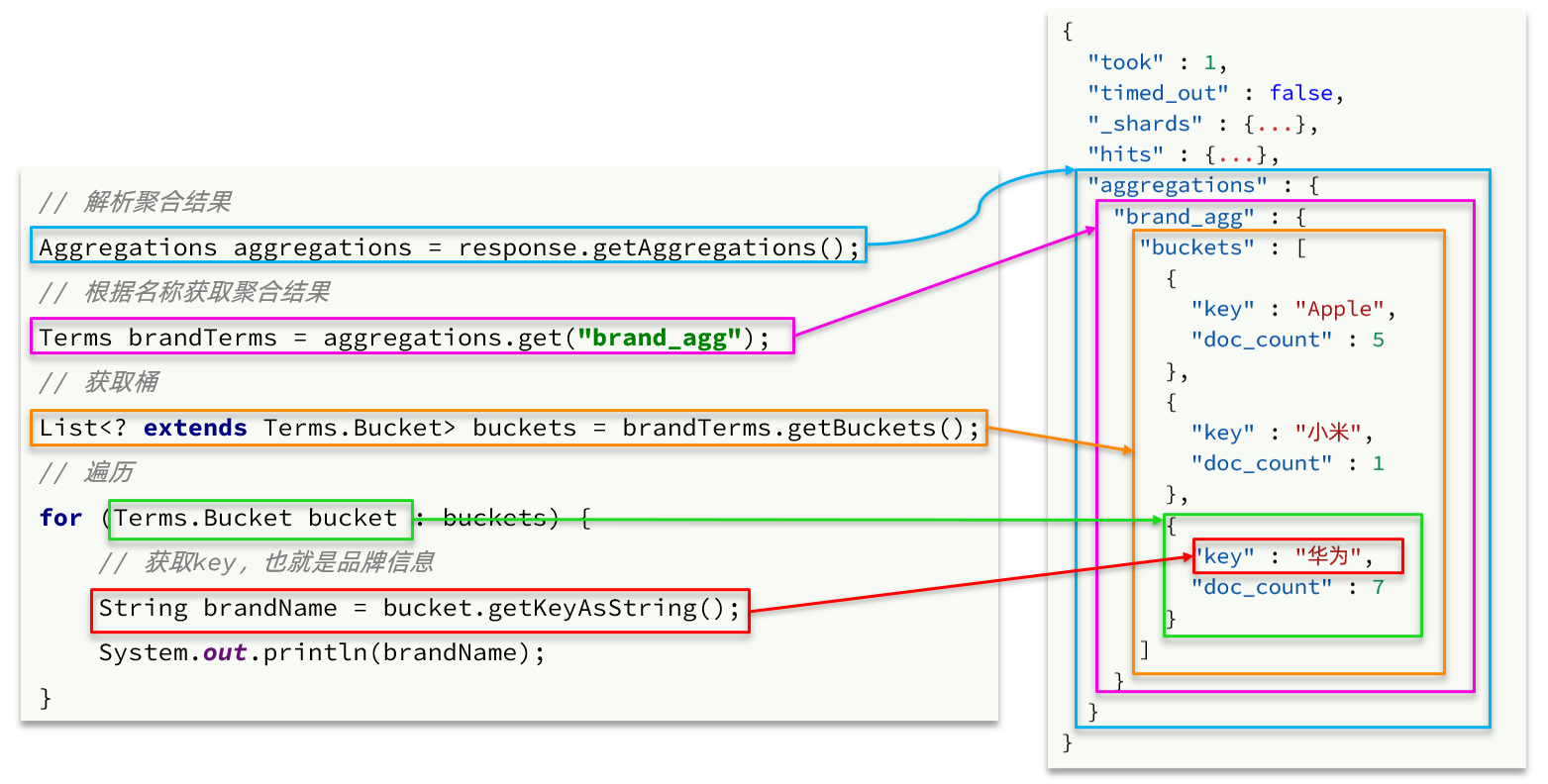 聚合结果与搜索文档同一级别,因此需要单独获取和解析。具体解析语法如下:
