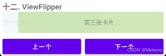 <ViewFlipperandroid:id="@+id/viewFlipper"android:layout_width="match_parent"android:layout_height="50dp"android:layout_marginBottom="8dp"android:flipInterval="2000"android:autoStart="true"><TextViewandroid:layout_width="match_parent"android:layout_height="match_parent"android:gravity="center"android:text="第一张卡片"android:background="#BBDEFB" /><TextViewandroid:layout_width="match_parent"android:layout_height="match_parent"android:gravity="center"android:text="第二张卡片"android:background="#F8BBD0" /><TextViewandroid:layout_width="match_parent"android:layout_height="match_parent"android:gravity="center"android:text="第三张卡片"android:background="#C5E1A5" /></ViewFlipper>