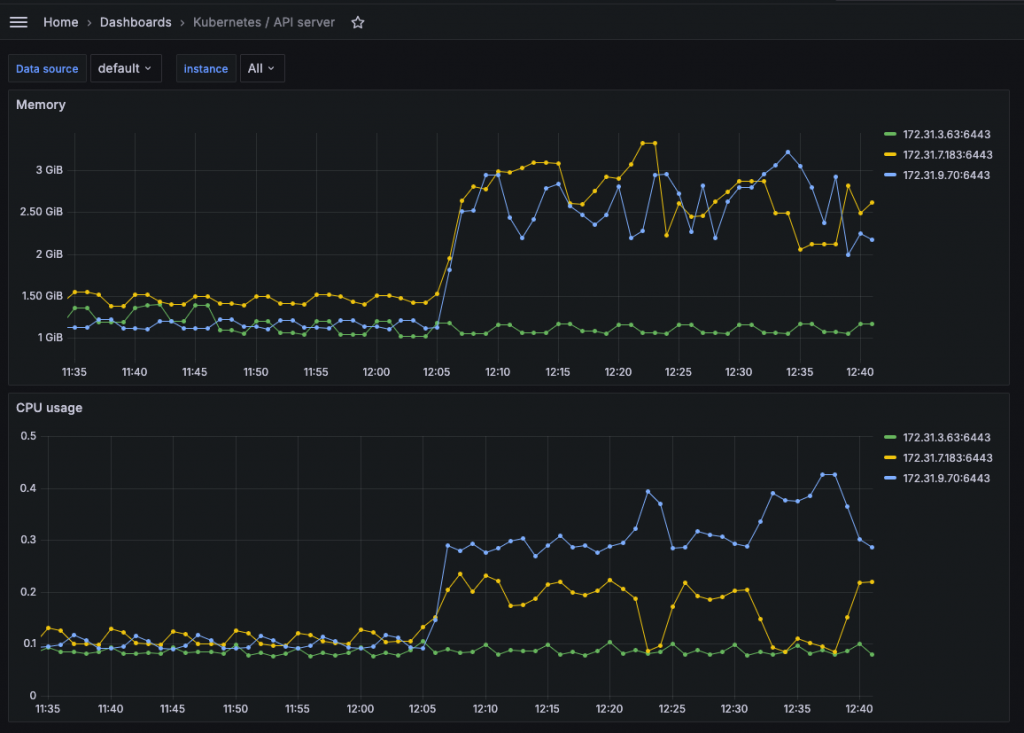 图 1:Rancher 2.11.1 上的 kubapiserver 负载,这是 QA 测试的一部分。Steve 的 “list” 负载由 k6 生成,然后 Steve 又加载 Kubernetes API Server,此处由 Rancher Monitoring 进行监控。
