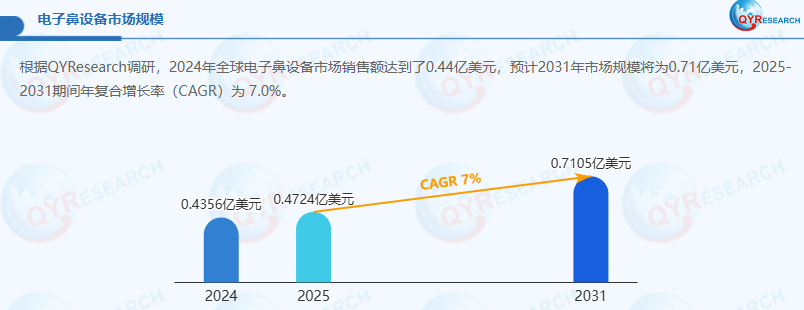 根据QYResearch调研,2024年全球电子鼻设备市场销售额达到了0.44亿美元,预计2031年市场规模将为0.71亿美元,2025-2031期间年复合增长率(CAGR)为 7.0%。