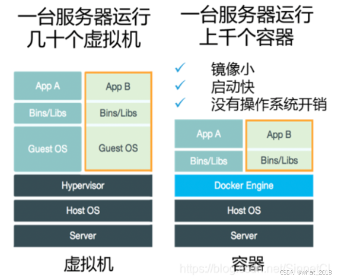 每一个虚拟机里面都有一套完整的操作系统,而容器层安装在操作系统之上,它直接利用了宿主机的内核,更加轻量化,启动速度极快。通常,我们在会每个容器里面跑单个的应用,而在虚拟机里会跑很多应用。下图展示了虚拟机和容器的不同。