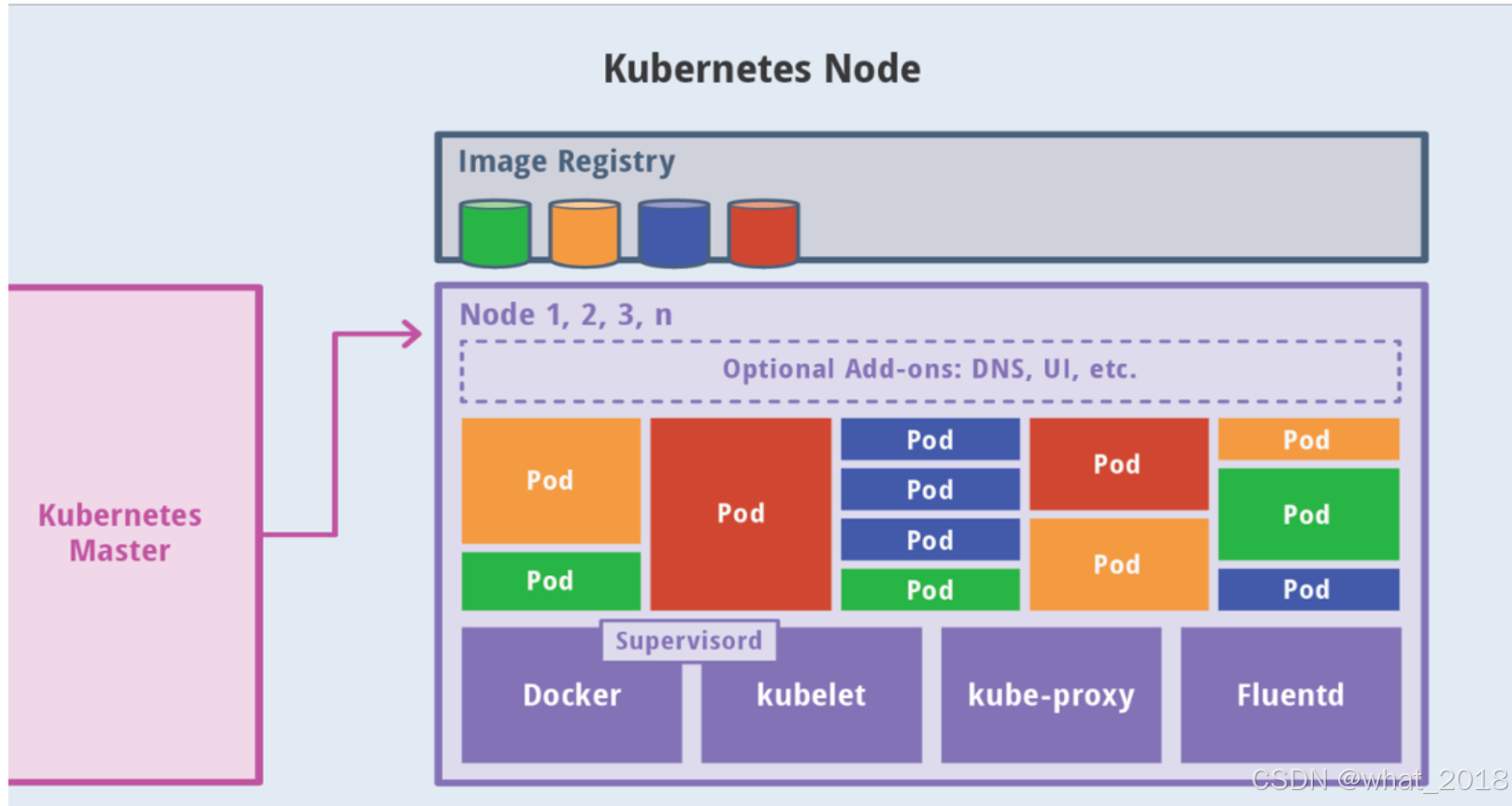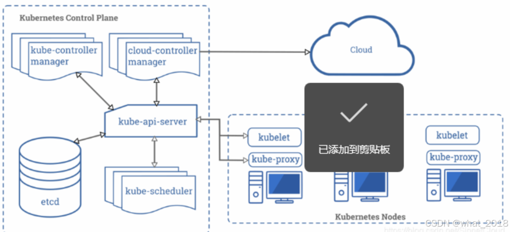 Node节点中包括运行在各个节点的客户端的kubelet,运行在各个节点的网络代理组件kube-proxy,支持运行容器底层环境的软件Container Runtime。
