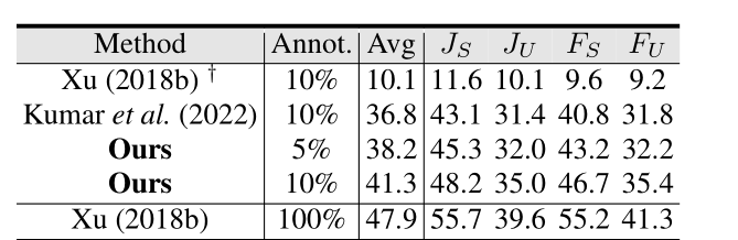 表4:泛化能力:Youtube-VOS上的性能比较。JS和JU分别是已见类别和未见类别的杰卡德系数;FS FU分别是已见类别和未见类别的边界指标。†表示10%监督学习的结果。 JS用来评估模型对已见过类别的预测结果与真实结果的相似程度 ,值越接近1表示相似性越高、模型性能越好.JU反映模型对新类别对象的泛化能力 ,值越大表明模型对新类别识别效果越好。FS用于衡量模型预测的已见类别目标边界与真实边界的契合程度,在涉及目标定位、分割等任务中很关键,数值越高说明模型对已见类别目标边界预测越精准。FU主要评估模型对未见类别目标边界的预测精准度,体现模型对新类别目标在空间位置界定上的能力,分数越高意味着对未见类别目标边界预测越准确。