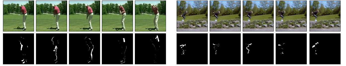 图3:像素差异(DoP)可视化。第一行展示RGB帧,第二行展示沿时间维度的地面真值像素差异图。我们展示两种场景:左侧:静态:背景恒定;主体运动;右侧:动态:背景变化;主体运动。时间差异突出了连续帧之间边界像素的变化。