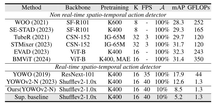 表 2:AVA 数据集的评估。K 是输入视频剪辑的长度。A 表示注释百分比。FPS是每秒传输帧数,FPS数值越高,意味着单位时间内展示的画面越多,动作过渡越自然、流畅 ,能更精准捕捉快速运动细节。mAP 表示 f-mAP@0.5。YOWO2-N 表示纳米版本。